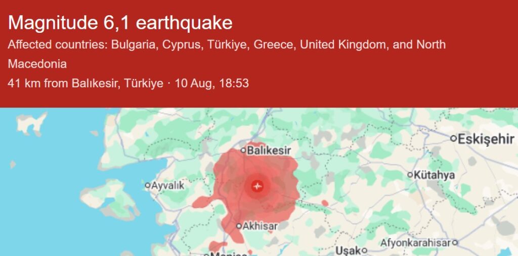| In Noord West Turkije, op z`n 200 km van Istanboel was er op 10 augustus rond 8 uur ’s avonds een aardbeving met een kracht van M6.1 (USGS >>>)