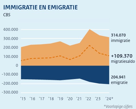 Om te beginnen even het demografisch rekensommetje voor 2024: Er kwamen 314.000 migranten het land in, terwijl 204.000 mensen het land verlieten. Dat betekent een positief migratie saldo van 109.000