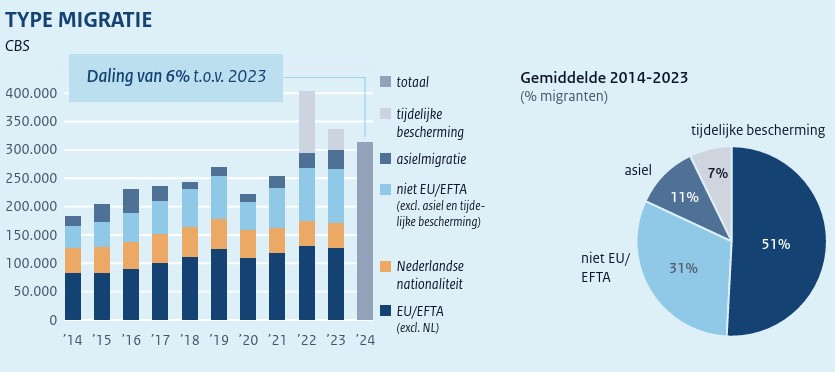 In 2024 kwamen er in totaal circa 314.000 mensen naar Nederland, wat neerkomt op een afname van 6 procent vergeleken met 2023.