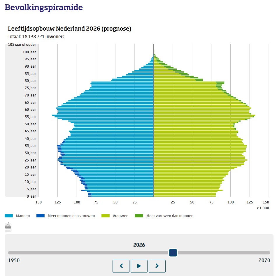 De bevolkingspiramide is een interessant interactief tooltje. om voorde klas te gebruiken Je ziet de huidige leeftijdsopbouw, de verdeling mannen en vrouwen en je kunt de cohorten afzonderlijk aanklikken voor meer gegevens.