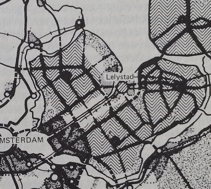 De kaart hiernaast laat zien dat naast die droogmakerijen in het oostelijke deel ook het westelijk deel van het IJsselmeer drooggelegd zou worden waarbij Lelystad het Geografische en economische hart van de IJsselmeerpolders zou worden.