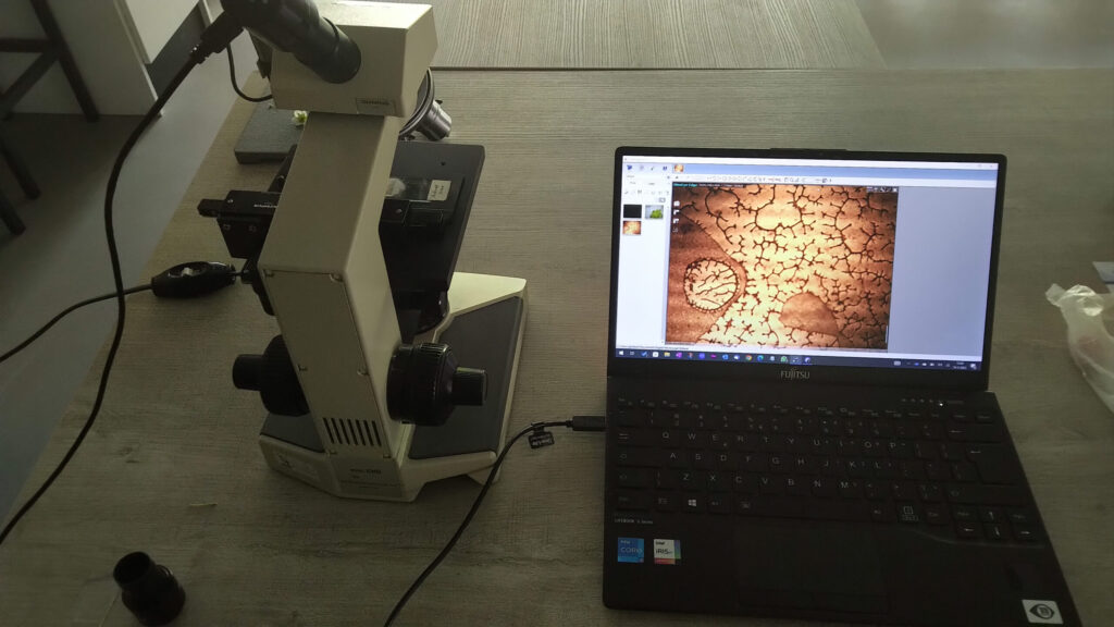 Wil je echter wel een microscoop gebruiken in de les en beeld delen met de klas. Dan kan dat ook. Je kunt voor een gewone microscoop het oculair vervangen door een digitaal oculair. En dan kun je het beeld via je laptop ook in de klas delen. Ik deed dat (hier plaatje rechts) met een oude (maar goede) microscoop met een digitaal oculair (bij toeval ook van Dino) en sloot die aan op de laptop