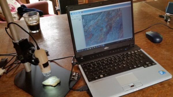 Hierboven de opstelling van een Digitale hand microscoop met laptop. Het microscoopje is van Dino . Die zijn te koop voor een paar tientjes maar ook beschikbaar in wat betere / professionelere en dus duurdere versies. Ik heb ervoor gekozen om er een statief bij aan te schaffen. De software krijg je erbij / downloadbaar.