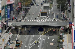 Tussen de flatgebouwen in de Japanse stad Fukuoka is een dinsdag een enorm gat in de weg ontstaan. Het zogeheten zinkgat heeft volgens Japanse media een doorsnede van zeker enkele tientallen meters. Sinkholes vind je overal op de wereld .. … Lees verder →