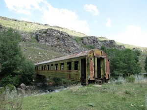 Bij gebrek aan een fatsoenlijke brug werd in het afgelegen Diliska (Georgië) een treinwagon als brug ingezet.